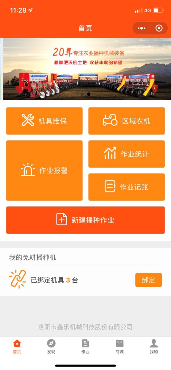 - 首頁:為登錄用戶提供創建作業、機具維保、區域農機、作業報警、作業統計及作業記賬等重點功能的快捷入口。