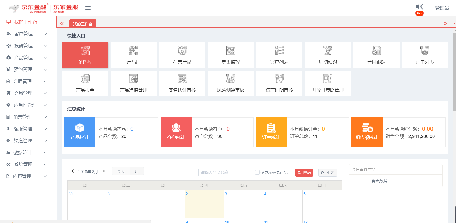 - 我的工作臺:提供系統菜單快捷入口,統計核心業務數據及開放期內的產品日歷事件展示