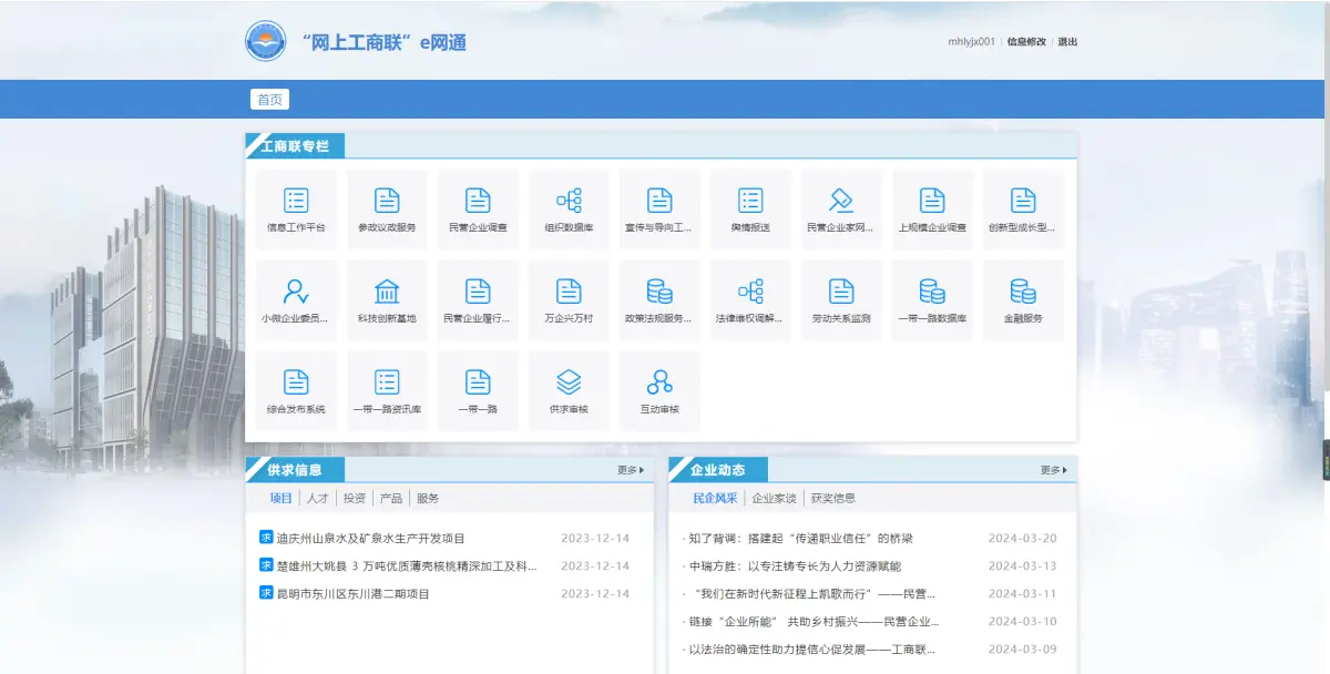 網上工商聯工程(一期)項目建設內容,包括政務外網桌面應用端、互聯網桌面應用端。政務外網桌面應用端用于整合各應用系統管理端相關的服務,滿足辦公高效、服務對口、填報便捷、資源共享等共性服務需求,支撐各項業務的順利開展?;ヂ摼W桌面應用端用于整合面向執常委、代表人士、會員等各應用系統的服務,,實現互聯互通、協同辦公、數據互通、應用共享、便捷實用的網上工商聯互聯網服務統一入口。